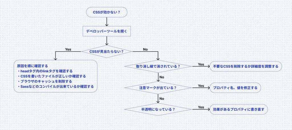 詳細は本記事で解説しますが、CSSが効かなかった時のフローチャートです!ダウンロードしていつでも使えるようにするのがおすすめ!