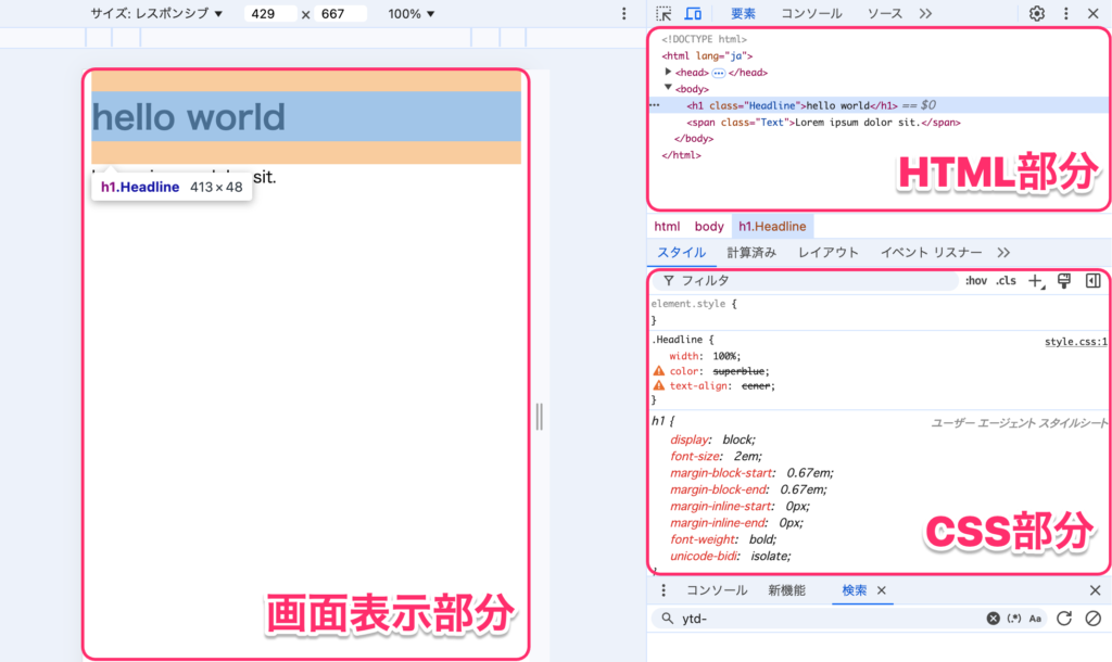 デベロッパーツールを開くと次のように、画面表示部分、HTML部分、CSS部分が出てきますね💻